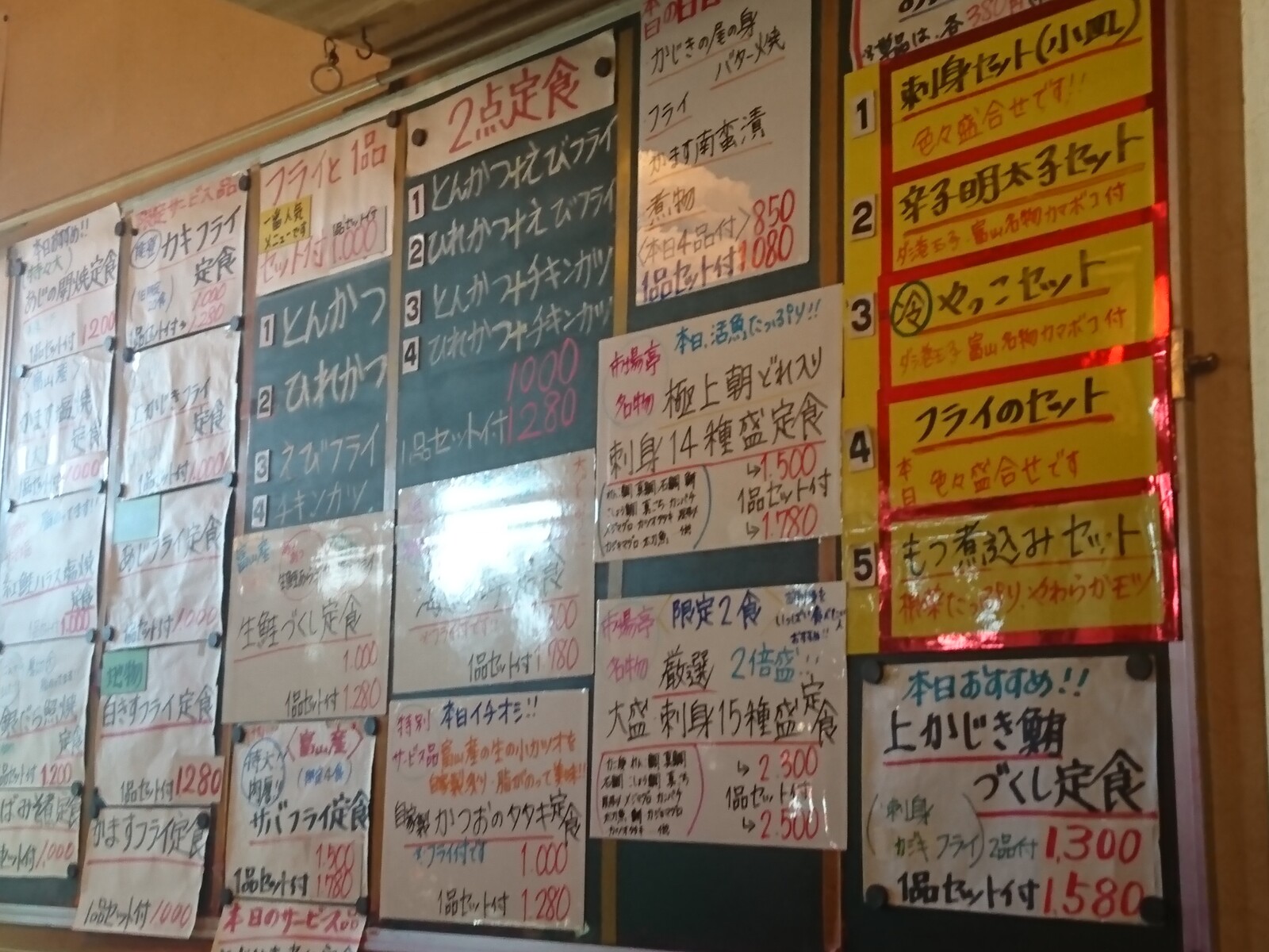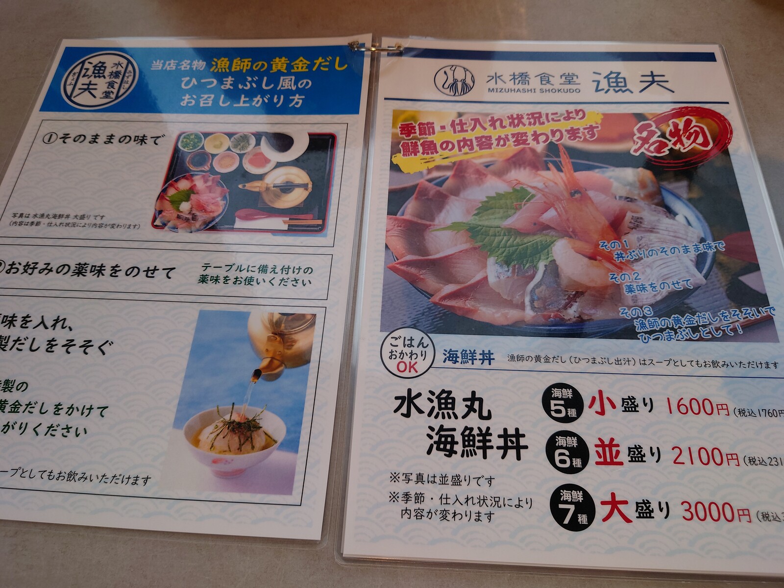 水橋の漁港の縁に、美味しい魚を食べさせてくれる食堂ができたのは、おととしの10月のこと。それから1年半ほど経って、ようやくこの店を訪れる機会があったんだ。お店の名前は「水橋食堂 漁夫」。テレビのグルメ番組にも登場した、人気のお店だよ。