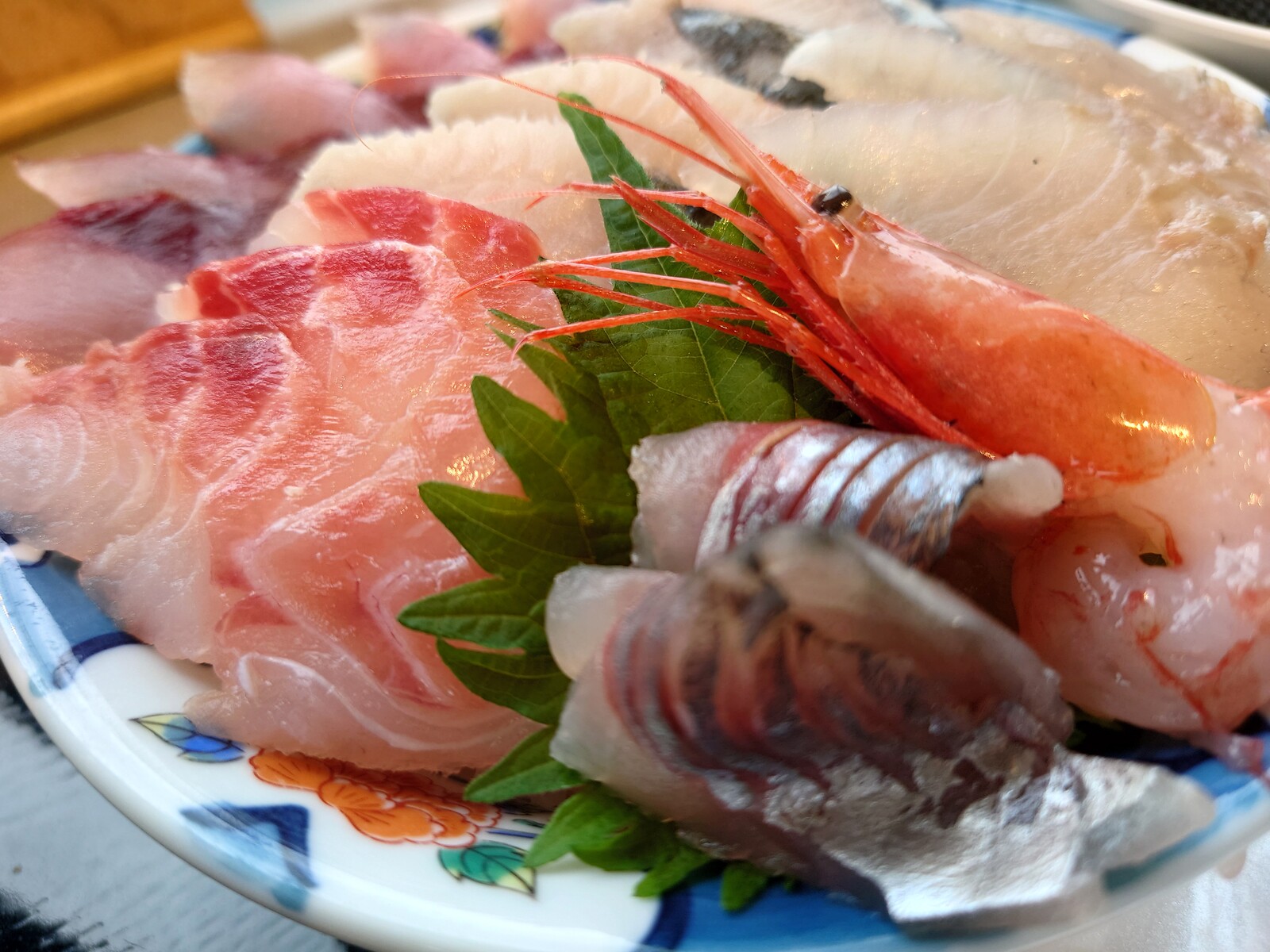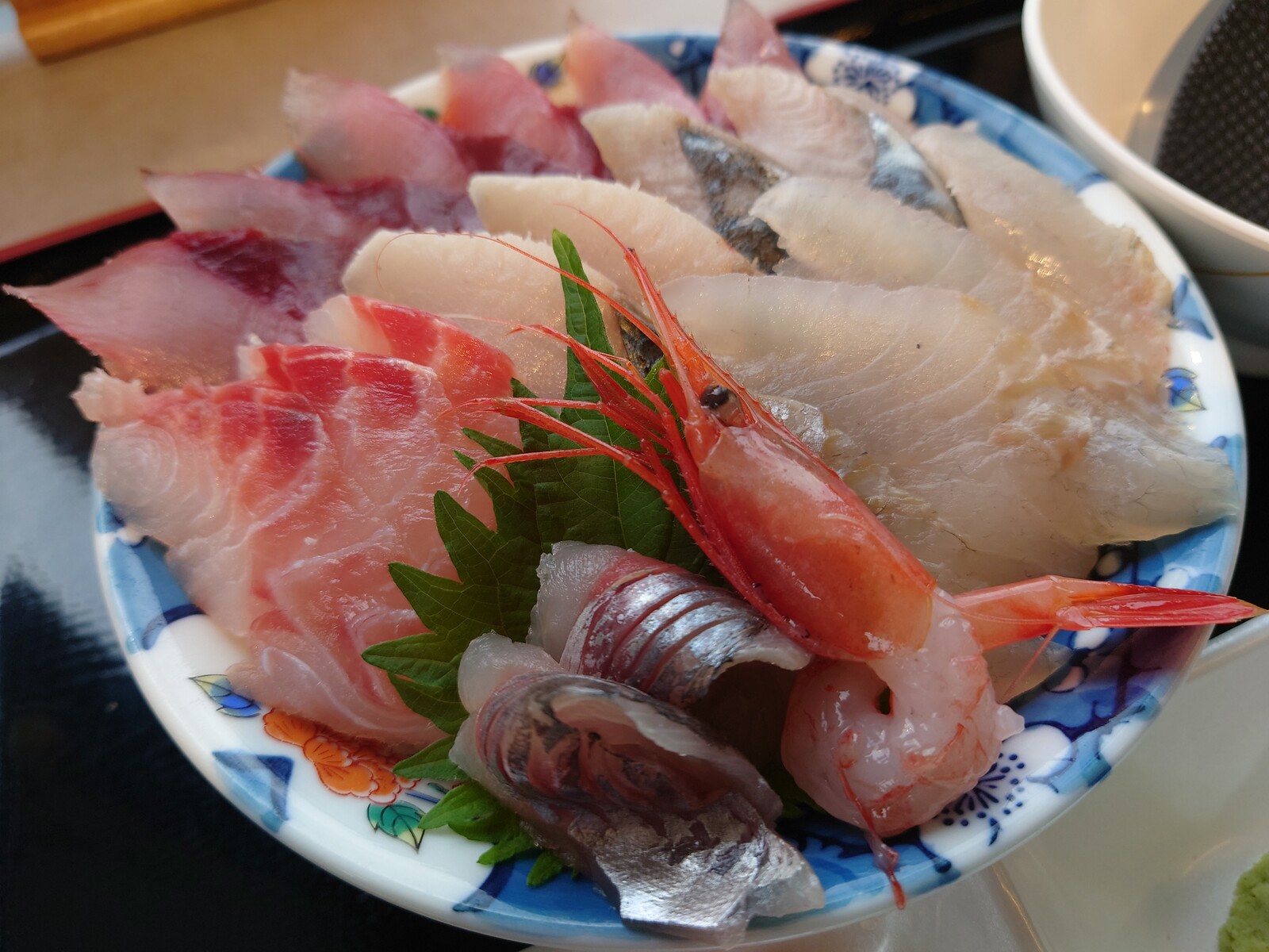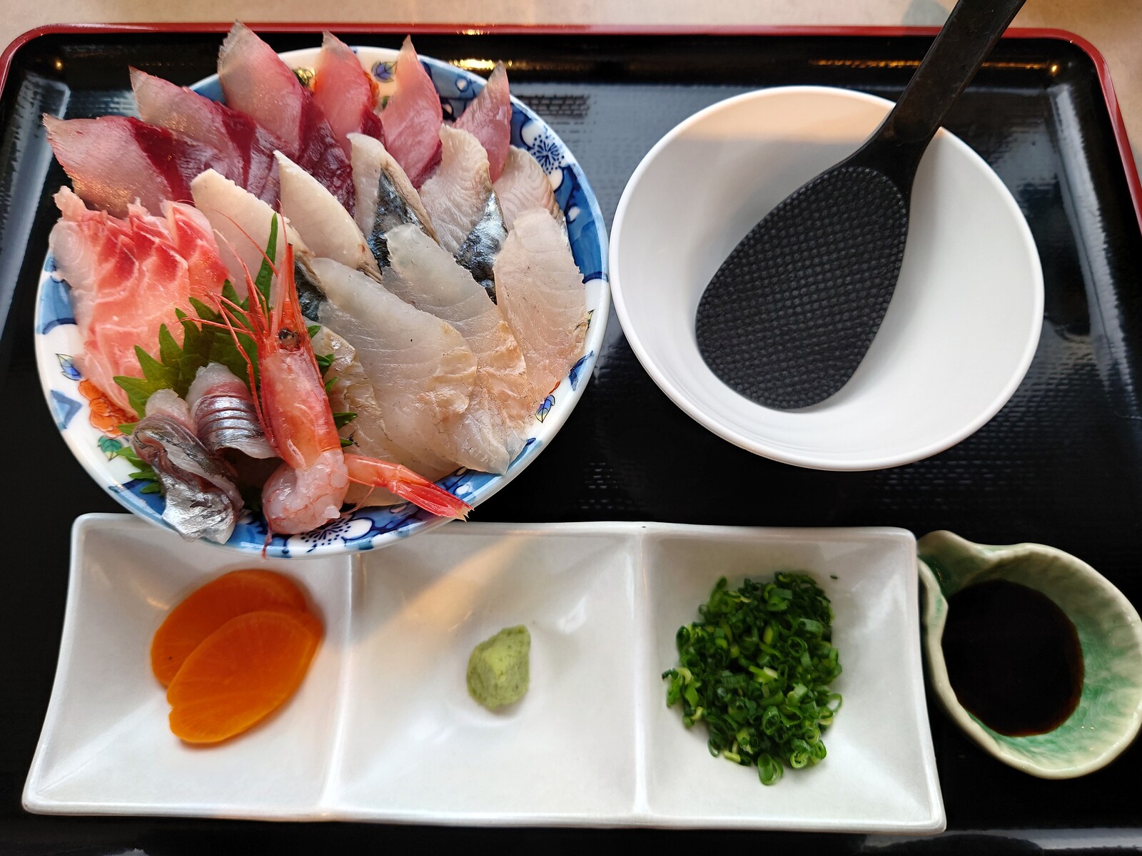 ご飯をおおいつくす、新鮮な富山の幸。カンパチ、キジハタ、アジ、甘エビと、う〜ん、あと2品はなんだっただろ?ご飯を魚でくるんでいただくんだけど、これだけ魚があると、ご飯がなくなってしまいそうなんだ。