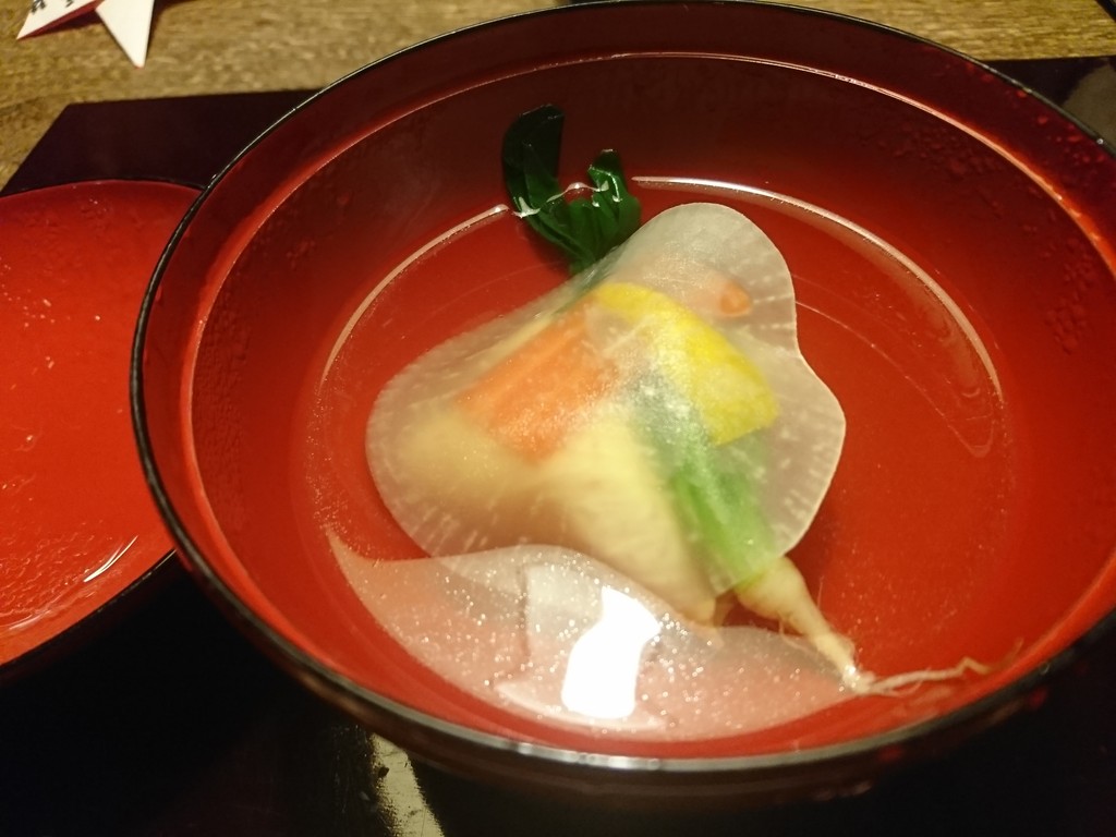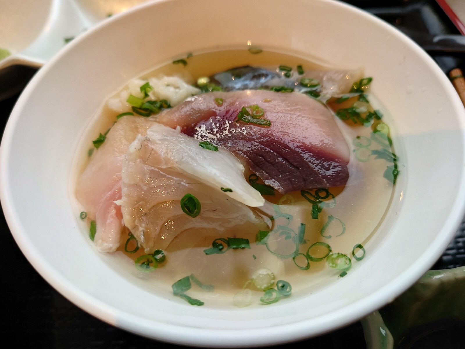ご飯茶碗は、少しとってだしをかけていただくという、ひつまぶしのような食べ方のためについていたんだ。少し熱が通った刺身は、食感と味が変わって、これまた素敵。何よりこのだしが見事で、スープとしてそれだけで味わっても、十分楽しめる逸品だったんだ。