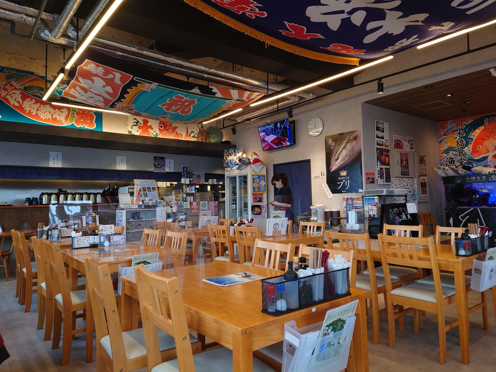 天井に大漁旗がかけてあるから、テーブルに座っているだけで気持ちが上がるよね。